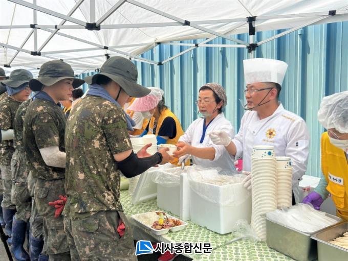 À̳¯ ÇöÀå¿¡¼´Â Àüº¹»ï°èÁ×, °¥ºñÂò, ¿À¸®ÈÆÁ¦ººÀ½ µîÀ¸·Î ±¸¼ºµÈ ÃÑ 350ÀκÐÀÇ µû¶æÇÑ ½Ä»ç°¡ Á¦°øµÆ´Ù. ¿¬ÀÏ À̾îÁø Æø¿° ¼Ó¿¡¼ º¹±¸ ÀÛ¾÷¿¡ Èû¾²°í ÀÖ´ø ±º À庴°ú ÀÚ¿øºÀ»çÀÚ, ÁֹεéÀº Á¤¼º½º·¹ ÁغñµÈ ½Ä»ç¿¡ °¨»ç Àλ縦 ÀüÇß´Ù.