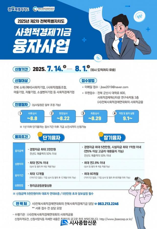 µµ´Â 2025³â Á¦2Â÷ »çȸÀû°æÁ¦±â±Ý À¶ÀÚ»ç¾÷À» ÅëÇØ ÀüºÏ¿¡ ¼ÒÀçÇÑ ¿¹ºñ»çȸÀû±â¾÷, (»çȸÀû)Çùµ¿Á¶ÇÕ, ¸¶À»±â¾÷, ÀÚȰ±â¾÷, ¼Ò¼Èº¥Ã³±â¾÷ µîÀ» ´ë»óÀ¸·Î ÀÚ±ÝÀ» Áö¿øÇÒ °èȹÀÌ´Ù. ½Åû Á¢¼ö´Â 8¿ù 1ÀϱîÁöÀ̸ç, ¼·ù½É»ç ¹× ÇöÀå½Ç»ç¸¦ °ÅÃÄ 8¿ù ¸» ÃÖÁ¾ Áö¿ø ´ë»ó ±â¾÷À» ¼±Á¤ÇÑ´Ù.