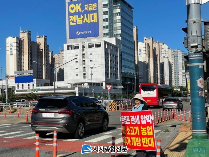 | ¿À¹ÌÈ Àü³²µµÀÇ¿øÀÌ 28ÀÏ Àü³²µµÃ» ¾Õ¿¡¼ ¡®Æ®·³ÇÁ °ü¼¼ ¾Ð¹Ú ½Ò¡¤¼Ò°í±â ³ó¾÷Ãß°¡°³¹æ ¹Ý´ë¡¯¹®±¸°¡ ÀûÈù ÇÇÄÏÀ» µé°í 1ÀÎ ½ÃÀ§¸¦ ¹úÀ̰í ÀÖ´Ù. |