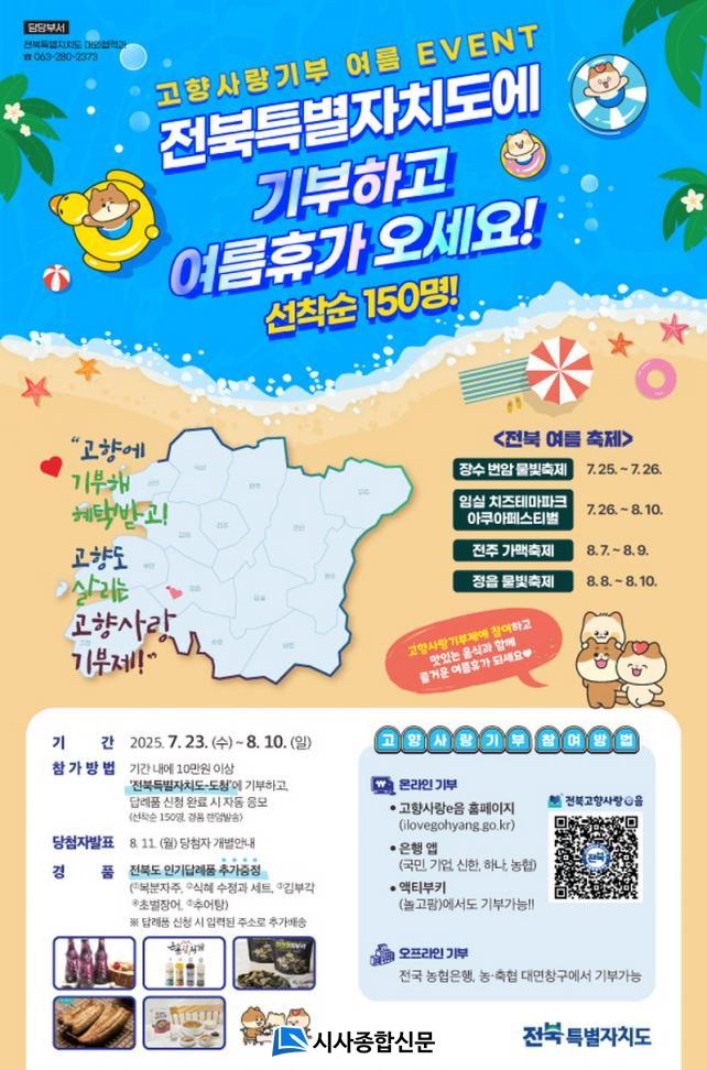 À̹ø À̺¥Æ®´Â ¡®ÀüºÏƯº°ÀÚÄ¡µµ-µµÃ»¡¯¿¡ 10¸¸ ¿ø ÀÌ»ó ±âºÎÇÑ »ç¶÷ Áß ¼±Âø¼ø 150¸íÀ» ´ë»óÀ¸·Î, ÀüºÏÀÌ ¾ö¼±ÇÑ Àα⠴ä·ÊǰÀ» Ãß°¡·Î Á¦°øÇÏ´Â Çà»ç´Ù. Áö±ÞµÇ´Â ¼±¹°Àº Ãß¾îÅÁ, ÃʹúÀå¾î µî ¿©¸§Ã¶ °Ç°À» À§ÇÑ Áö¿ª Ư»êǰÀ¸·Î ±¸¼ºµÇ¸ç, ¹«ÀÛÀ§·Î ¹ß¼ÛµÈ´Ù.
