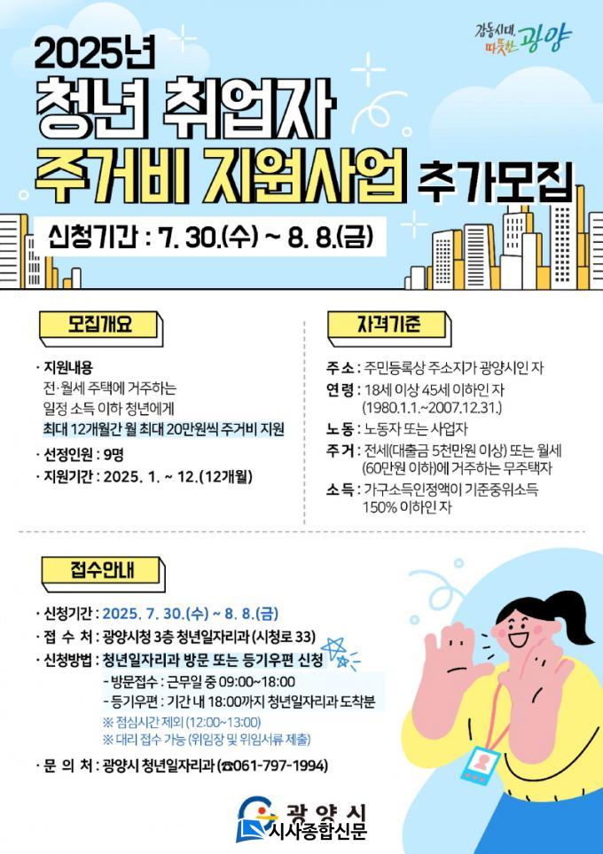 ½ÅûÀº 7¿ù 30ÀϺÎÅÍ 8¿ù 8ÀϱîÁö ±¤¾ç½Ãû û³âÀÏÀÚ¸®°ú¿¡ ¹æ¹®Çϰųª µî±â¿ìÆíÀ¸·Î Á¢¼öÇÒ ¼ö ÀÖÀ¸¸ç, ¿ìÆí ½Åû ½Ã 8¿ù 8ÀÏ 18½Ã±îÁö û³âÀÏÀÚ¸®°ú¿¡ µµÂøÇÑ ¼·ù¿¡ ÇÑÇØ Á¢¼ö°¡ ÀÎÁ¤µÈ´Ù.