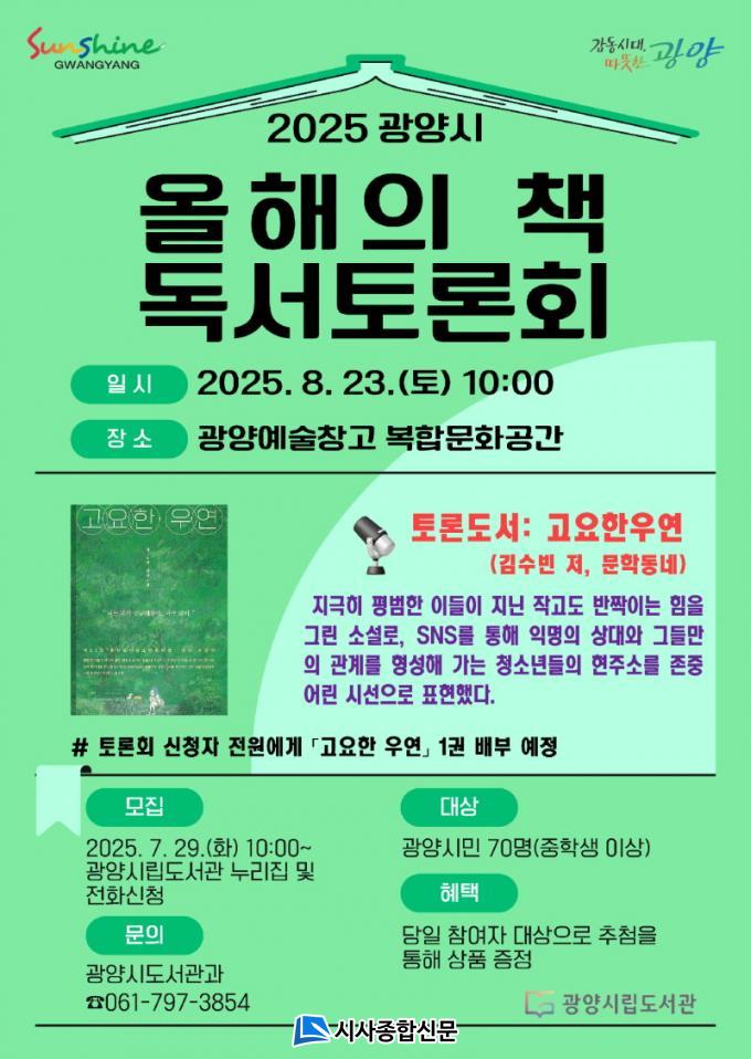 Çà»ç´Â ÁßÇлý ÀÌ»ó ±¤¾ç½Ã¹Î ´©±¸³ª Âü¿©ÇÒ ¼ö ÀÖÀ¸¸ç, 7¿ù 29ÀϺÎÅÍ ±¤¾ç½Ã¸³µµ¼°ü ´©¸®Áý(https://lib.gwangyang.go.kr/) ¶Ç´Â ÀüÈ ½ÅûÀ» ÅëÇØ Á¢¼öÇÒ ¼ö ÀÖ´Ù. ÀÚ¼¼ÇÑ »çÇ×Àº µµ¼°ü ´©¸®ÁýÀ» È®ÀÎÇϰųª µµ¼°üÁö¿øÆÀ(¢Ï061-797-3854)¿¡ ¹®ÀÇÇÏ¸é µÈ´Ù.