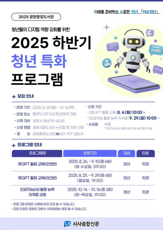 ¡®ÃªGPT Ȱ¿ë ±³À°¡¯Àº 8¿ù 4ÀÏ ¿ÀÀü 10½ÃºÎÅÍ, ¡®ÀΰøÁö´É(AI) Ȱ¿ë ´É·Â ÀÚ°ÝÁõ °úÁ¤¡¯Àº 9¿ù 29ÀÏ ¿ÀÀü 10½ÃºÎÅÍ °¢°¢ ¼±Âø¼ø Á¢¼ö¸¦ ½ÃÀÛÇÑ´Ù. ½ÅûÀº ±¤¾ç½Ã¸³µµ¼°ü ´©¸®Áý(https://lib.gwangyang.go.kr) ¶Ç´Â ÀüÈ(¢Ï061-797-3864)·Î °¡´ÉÇÏ´Ù. ±âŸ ÀÚ¼¼ÇÑ »çÇ×Àº ±¤¾çÁß¾Óµµ¼°üÀ¸·Î ¹®ÀÇÇÏ¸é µÈ´Ù.