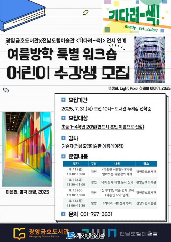 À̹ø ¿öÅ©¼óÀº ÃʵîÇб³ 1~4ÇгâÀ» ´ë»óÀ¸·Î Çϸç, ±¤¾ç±ÝÈ£µµ¼°ü ´©¸®Áý(https://lib.gwangyang.go.kr)À» ÅëÇØ 8¿ù 7ÀϱîÁö ¼±Âø¼ø Á¢¼ö¸¦ ¹Þ´Â´Ù. ÀÚ¼¼ÇÑ »çÇ×Àº µµ¼°ü ´©¸®ÁýÀ» È®ÀÎÇϰųª ÀüÈ(¢Ï061-797-3831)·Î ¹®ÀÇÇÏ¸é µÈ´Ù.