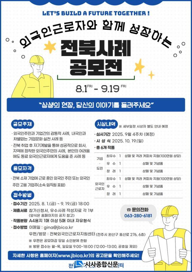 °ø¸ð ÁÖÁ¦´Â <»çÁø>ÀüºÏ¿¡¼ »ì¾Æ°¡´Â ¿Ü±¹ÀÎÁÖ¹ÎÀÇ »ýȰ ¸ð½À, <¿µ»ó>¿Ü±¹ÀÎÀÇ ½Ã¼±À¸·Î ¹Ù¶óº» ÀüºÏƯº°ÀÚÄ¡µµ »ç¿ë¹ýÀ¸·Î, Á¢¼ö´Â 9¿ù 5ÀÏ(±Ý)±îÁö ´ã´çÀÚ À̸ÞÀÏ·Î ¿Ü±¹ÀÎÁֹΰú ÇÔ²² ÆÀÀ» ÀÌ·ï ½ÅûÇÏ¸é µÇ¸ç, ÀÚ¼¼ÇÑ »çÇ×Àº ÀüºÏ±¹Á¦Çù·ÂÁøÈï¿ø °øÁö»çÇ×(www.jbica.kr)À» Âü°íÇÏ¸é µÈ´Ù.
