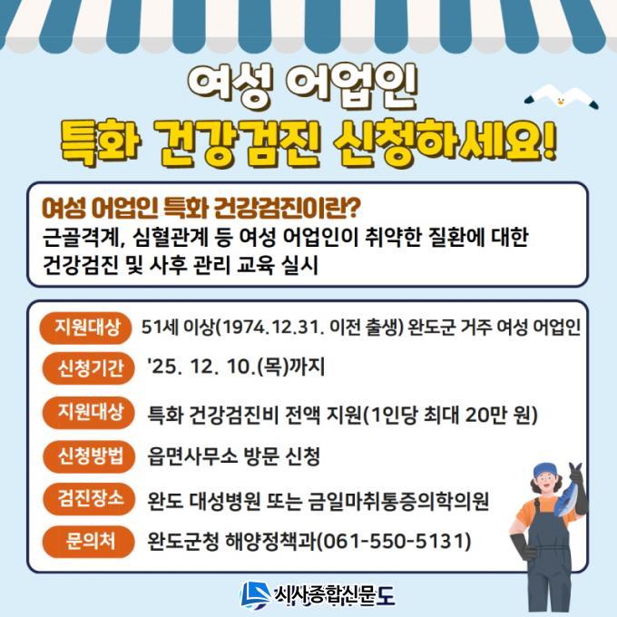 ÀÌ¿¡ ±ºÀº ¿©¼º ¾î¾÷ÀÎ 500¸í¿¡°Ô °Ç°°ËÁøºñ¸¦ Áö¿øÇÒ °èȹÀÌ´Ù. ½Åû ´ë»óÀº ±º¿¡ ÁÖ¼Ò¸¦ µÎ°í ÀÖ´Â 51¼¼ ÀÌ»ó(1974. 12. 31. ÀÌÀü Ãâ»ý) ¿©¼º Áß ¾î¾÷ °æ¿µÃ¼¿¡ µî·ÏµÆ°Å³ª ¸Ç¼Õ¡¤³ªÀá¾î¾÷ Á¾»çÀÚÀÌ´Ù. ´Ù¸¸ Áö³ÇØ Æ¯È °Ç°°ËÁøÀ» Áö¿ø¹Þ¾Ò°Å³ª ¿©¼º ³ó¾÷ÀΠƯ¼ö °Ç°°ËÁø ´ë»óÀÚ´Â Á¦¿ÜµÈ´Ù.