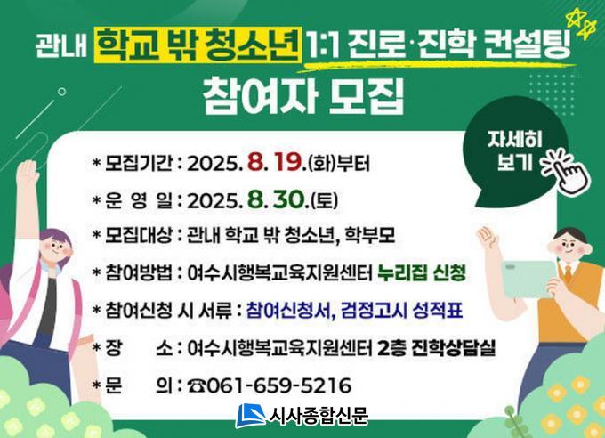 ¿©¼ö½ÃÇб³¹Ûû¼Ò³âÁö¿ø¼¾ÅÍ ¼Ò¼Ó û¼Ò³âÀº ´ãÀÓ ±³»ç¸¦ ÅëÇØ ½ÅûÇÒ ¼ö ÀÖ´Ù. ±× ¿Ü û¼Ò³âÀº 8¿ù 19ÀÏ(È)ºÎÅÍ ¿©¼ö½ÃÇູ±³À°Áö¿ø¼¾ÅÍ ´©¸®Áý(www.yeosu.go.kr/edu)¿¡¼ ½ÅûÇÏ¸é µÈ´Ù.