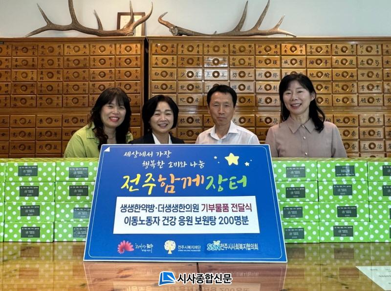 ÀüÁֽô 11ÀÏ ¿Ï»ê±¸ ÁßÈ»ê·Î¿¡ À§Ä¡ÇÑ »ý»ýÇÑ¾à¹æ¿¡¼ ¡®±âºÎ¹°Ç° Àü´Þ½Ä¡¯À» °¡Á³´Ù. ÀÌ ÀÚ¸®¿¡¼ ´õ»ý»ýÇÑÀÇ¿ø¡¤»ý»ýÇÑ¾à¹æ(¿øÀå À̱¤Áø¡¤ÀÌÈ«½Å)Àº ÀüÁÖÁö¿ª À̵¿³ëµ¿ÀÚ¸¦ À§ÇÑ º¸¿øÅÁ 200»óÀÚ(ÃÑ 3200ÆÑ, ¾à 800¸¸ ¿ø »ó´ç)¸¦ ÈÄ¿øÇß´Ù.