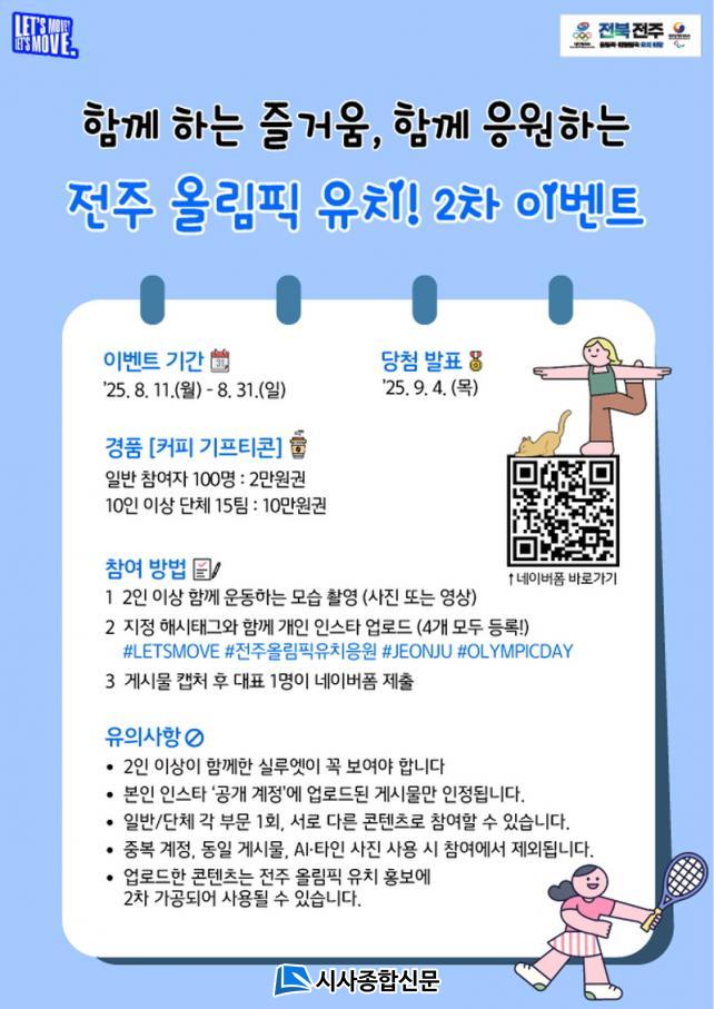 À̹ø Çà»ç´Â 8¿ù 11ÀϺÎÅÍ 31ÀϱîÁö Àü±¹ ´©±¸³ª 2ÀÎ ÀÌ»óÀÌ ÇÔ²² ¿òÁ÷ÀÌ´Â ¸ð½ÀÀ» »çÁøÀ̳ª ¿µ»óÀ¸·Î ÃÔ¿µÇØ °³ÀÎ SNS¿¡ °Ô½ÃÇϰí, Çʼö ÇØ½Ãű×(#LETSMOVE #ÀüÁֿø²ÇÈÀ¯Ä¡ÀÀ¿ø #OLYMPICDAY #JEONJU)¸¦ ´Þ¸é Âü¿©ÇÒ ¼ö ÀÖ´Ù. ½ºÆ®·¹Äª, »êÃ¥, ´í½º, ·¯´× µî °¡º¿î Ȱµ¿µµ °¡´ÉÇϸç, °Ô½Ã¹° ĸó¿Í ÇÔ²² Âü°¡ ½Åû¼(³×À̹ö Æû)¸¦ Á¦ÃâÇϸé ÀÀ¸ð°¡ ¿Ï·áµÈ´Ù.