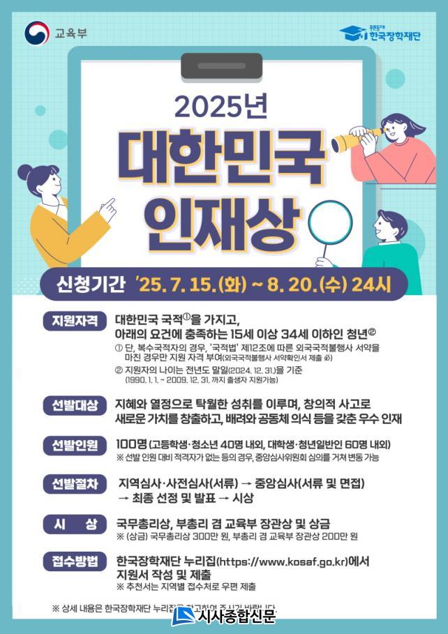 ´ëÇѹα¹ ±¹ÀûÀ» °¡Áø 15¼¼ ÀÌ»ó 34¼¼ ÀÌÇÏ Ã»³âÀÌ¸é ´©±¸³ª µµÀüÇÒ ¼ö ÀÖ´Ù. Àü±¹¿¡¼ °íµîÇлý‧û¼Ò³â 40¸í, ´ëÇлý․û³â 60¸í µî ÃÑ 100¸íÀ» ¼±¹ßÇÑ´Ù. ¼±¹ßµÈ 100¸í Áß 1¸í¿¡°Ô´Â ±¹¹«ÃѸ®»ó°ú »ó±Ý 300¸¸ ¿øÀÌ, 99¸í¿¡°Ô´Â ºÎÃѸ® °â ±³À°ºÎÀå°ü»ó°ú »ó±Ý 200¸¸ ¿øÀÌ ¼ö¿©µÈ´Ù.