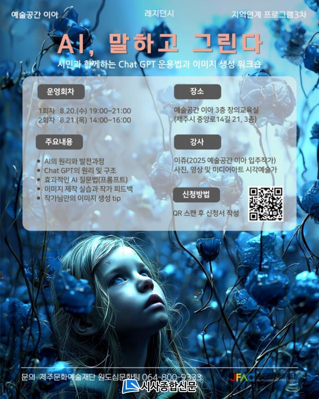 [½Ã»çÁ¾ÇսŹ® = °í¼º¹Î ±âÀÚ] Á¦ÁÖ¹®È¿¹¼úÀç´Ü(ÀÌ»çÀå ±è¼®À±, ÀÌÇÏ Àç´Ü)Àº ¿À´Â 20ÀÏ(¼ö)°ú 21ÀÏ(¸ñ) ¾çÀϰ£ ¿¹¼ú°ø°£ ÀÌ¾Æ 3Ãþ âÀDZ³À°½Ç¿¡¼ ½Ã¹ÎÀ» ´ë»óÀ¸·Î ÇÑ Ã¢ÀÛ ÇÁ·Î±×·¥¡®AI ¸»ÇÏ°í ±×¸°´Ù – ½Ã¹Î°ú ÇÔ²²ÇÏ´Â AI À̾߱⡯Âü¿©ÀÚ¸¦ ¸ðÁýÇÑ´Ù.