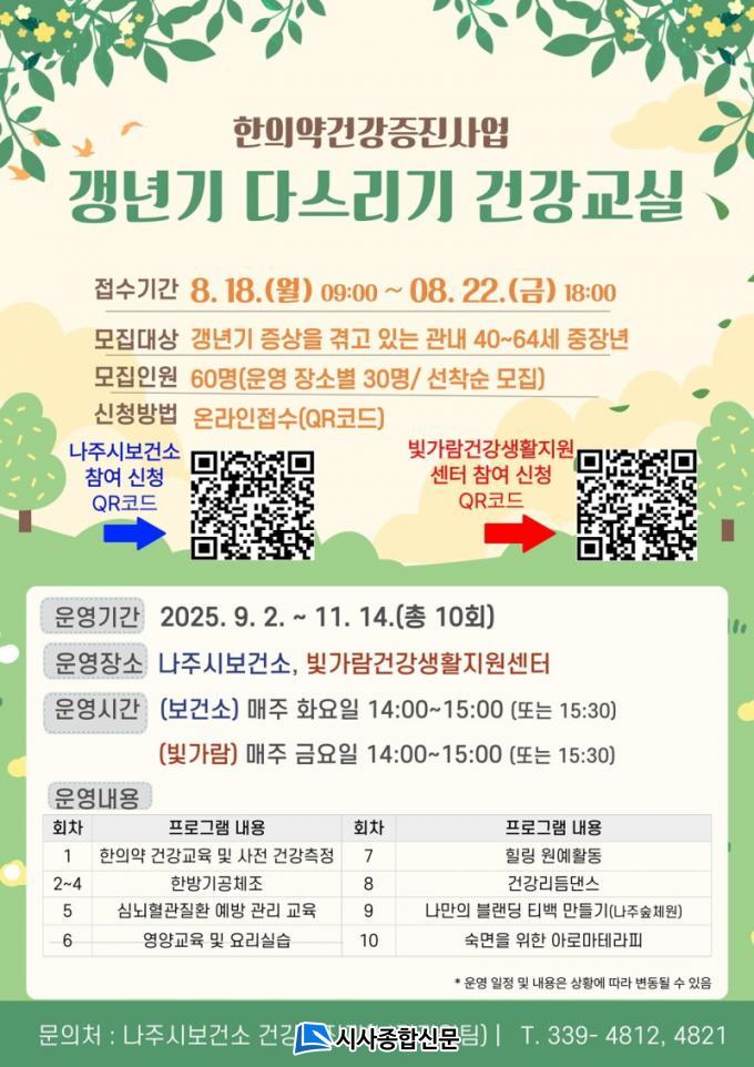 ÀÌ ÇÁ·Î±×·¥Àº ³ªÁֽÿ¡ °ÅÁÖÇÏ¸ç °»³â±â Áõ»óÀ» °Þ°í ÀÖ´Â ¸¸ 40¼¼ºÎÅÍ 64¼¼±îÁöÀÇ ÁßÀå³âÃþÀ» ´ë»óÀ¸·Î 9¿ùºÎÅÍ ¸ÅÁÖ 1ȸ¾¿ ÃÑ 10ÁÖ°£ ³ªÁֽú¸°Ç¼Ò¿Í ºû°¡¶÷°Ç°»ýȰÁö¿ø¼¾ÅÍ¿¡¼ ÁøÇàµÈ´Ù.