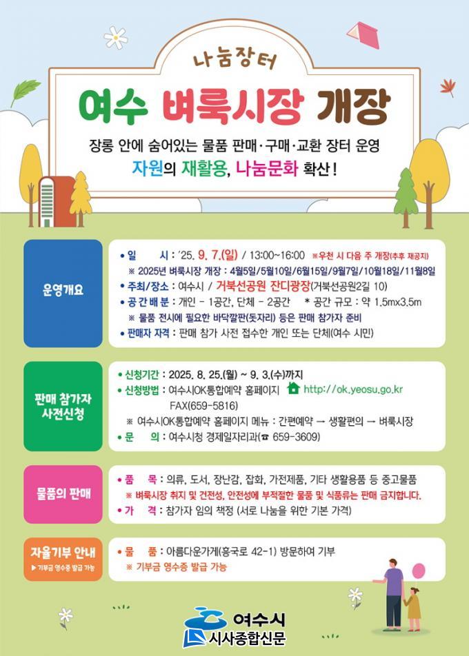 º·è½ÃÀå ÆÇ¸Å Âü¿©¸¦ ¿øÇÏ´Â ½Ã¹ÎÀº 8¿ù 25ÀÏ(¿ù)ºÎÅÍ 9¿ù 3ÀÏ(¼ö)±îÁö ¿©¼ö½Ã OKÅëÇÕ¿¹¾à½Ã½ºÅÛ ¶Ç´Â ÆÑ½º(061-659-5816)¸¦ ÅëÇØ ½ÅûÇÏ¸é µÈ´Ù.