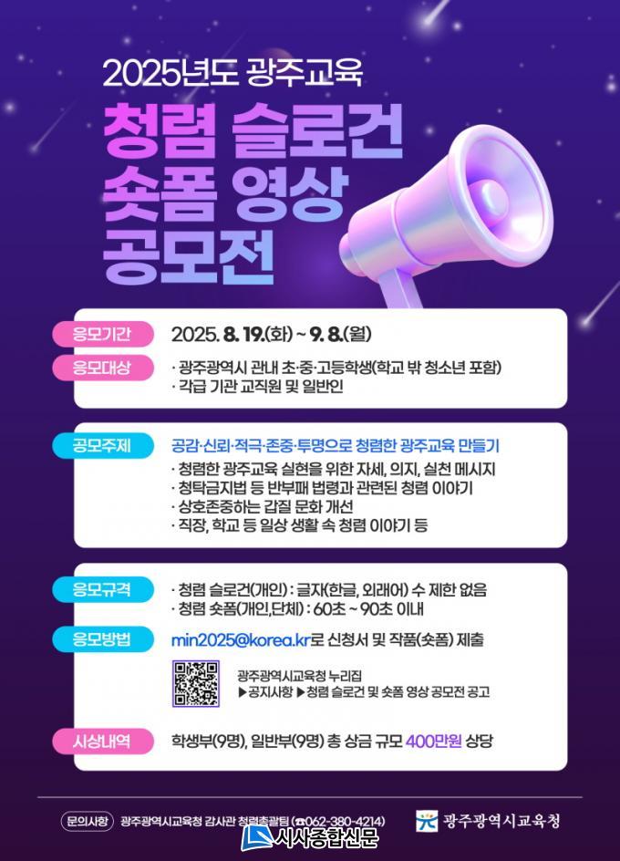´ë»óÀº ±¤ÁÖÁö¿ª Çлý, Çб³ ¹Û û¼Ò³â, ±³Á÷¿ø, ÀϹÝÀÎ µîÀ̸ç, ¡®°ø°¨¡¤½Å·Ú¡¤Àû±Ø¡¤Á¸Áß¡¤Åõ¸íÀ¸·Î û·ÅÇÑ ±¤ÁÖ±³À° ¸¸µé±â¡¯¸¦ ÁÖÁ¦·Î ûʱÝÁö¹ý Áؼö, °©Áú ¹®È °³¼±, ÀÏ»ó ¼Ó û·Å ½Çõ µîÀÇ ³»¿ëÀ¸·Î Á¦ÀÛÇÏ¸é µÈ´Ù. Âü¿© Èñ¸ÁÀڴ û·Å½½·Î°Ç ¶Ç´Â 60~90ÃÊ À̳» ¼ôÆûÀ» Á¦ÀÛÇØ °ø¸ð±â°£¿¡ ÀüÀÚ¿ìÆí(min2025@korea.kr)À¸·Î ½Åû¼¿Í ÀÛǰÀ» Á¦ÃâÇÏ¸é µÈ´Ù.