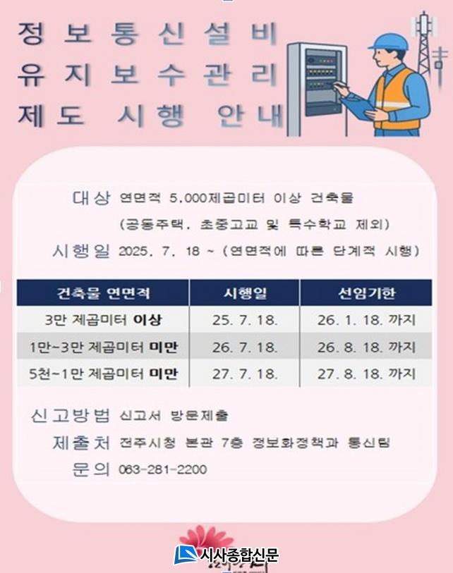 ÀÌ Á¦µµ´Â ÀÏÁ¤ ±Ô¸ð ÀÌ»ó °Ç¹° ³» Åë½Å ¼³ºñ¸¦ ü°èÀûÀ¸·Î °ü¸®ÇØ ÈÀ糪 Á¤Àü, Åë½Å Àå¾Ö¿Í °°Àº µ¹¹ß »óȲ¿¡¼ ½Ã¹ÎµéÀÌ °ÞÀ» ºÒÆíÀ» ÁÙÀ̰í, ¾ÈÀüÇÑ Åë½Å ȯ°æÀ» º¸ÀåÇϱâ À§ÇØ µµÀԵƴÙ. ÀÌ¿¡ µû¶ó °ÇÃ๰ÀÇ °ü¸®ÁÖü´Â Á¤º¸Åë½Å¼³ºñ °ü¸®ÀÚ¸¦ Á÷Á¢ ¼±ÀÓÇϰųª, Á¤º¸Åë½Å°ø»ç ¾÷ü ¶Ç´Â ¿ë¿ª¾÷ü¿¡ À¯Áöº¸¼ö¸¦ À§Å¹ÇØ¾ß ÇÑ´Ù.