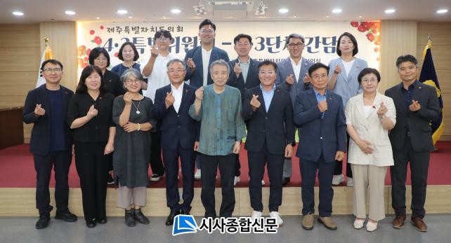 Áö³ 20ÀÏ ¿ÀÈÄ 3½Ã, µµÀÇȸ ´ëȸÀǽǿ¡¼ ¿¸° À̳¯ °£´ãȸ¿¡´Â Á¦ÁÖ4¡¤3Èñ»ýÀÚÀ¯Á·È¸, Á¦ÁÖ4¡¤3±â³ä»ç¾÷À§¿øÈ¸, Á¦ÁÖ4¡¤3µµ¹Î¿¬´ë, Á¦ÁÖ4¡¤3¿¬±¸¼Ò µî 4¡¤3 °ü·Ã ´Üü ÀÓ¿øÁøÀÌ Ä§¼®ÇØ 4¡¤3Ưº°À§¿øÈ¸¿Í »ó°ß·Ê¸¦ °âÇϰí Çö¾ÈÀ» °øÀ¯Çß´Ù.