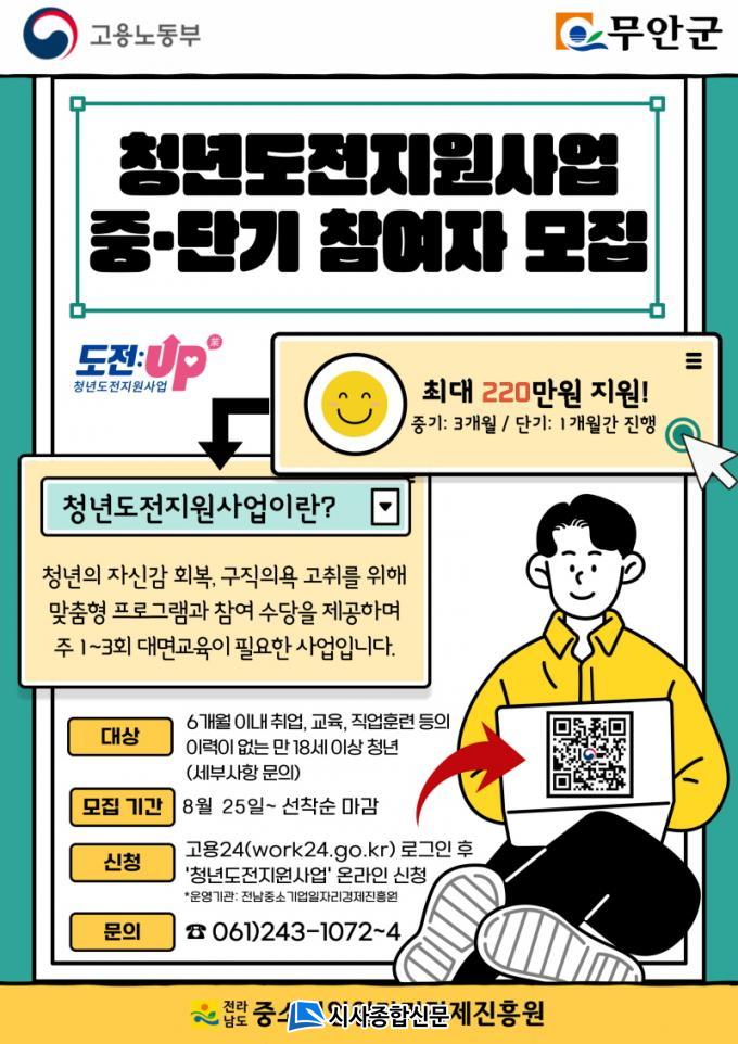 ¸ðÁý ´ë»óÀº 6°³¿ù À̳» °í¿ëº¸Çè °¡ÀÔ ¹× »ç¾÷ü ¿î¿µ, ±³À°, Á÷¾÷ÈÆ·Ã µîÀÇ ÀÌ·ÂÀÌ ¾ø´Â ¸¸ 18¼¼~34¼¼ÀÇ ¹ÌÃë¾÷ û³âÀ¸·Î, ¹«¾È±º Á¶·Ê»ó û³âÀ¸·Î Á¤ÀǵǴ ¸¸ 45¼¼ ÀÌÇÏÀÇ ±º¹Îµµ Âü¿©ÇÒ ¼ö ÀÖÀ¸¸ç, ½ÅûÀº °í¿ë24 ´©¸®Áý(www.work24.go.kr)À» ÀÌ¿ëÇϰųª, Àü³²ÀÏÀÚ¸®Á¾ÇÕ¼¾ÅÍ(¢Ï061-243-1072~4)À¸·Î ¹®ÀÇÇÏ¸é µÈ´Ù.
