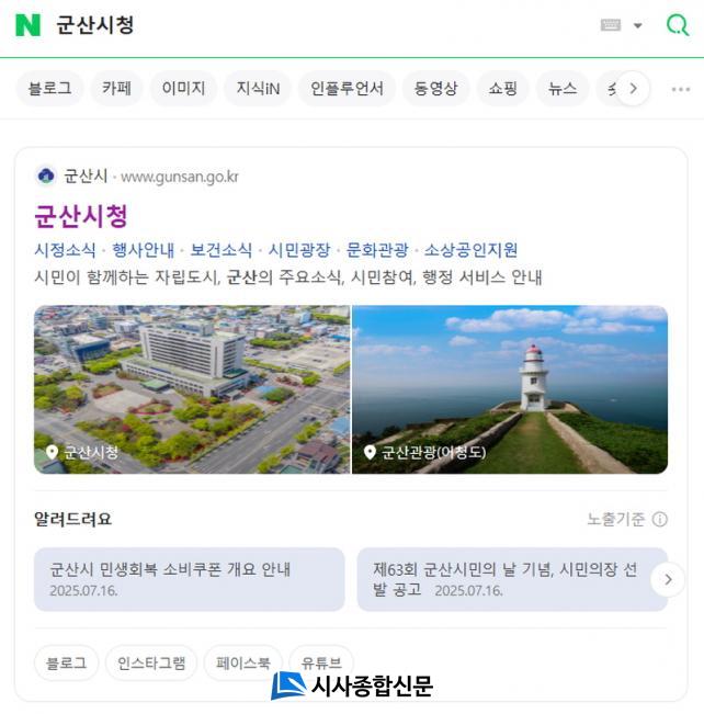 ¾ÕÀ¸·Î ½Ã¹ÎµéÀº ³×À̹ö °Ë»öâ¿¡ ¡®±º»ê½Ã¡¯ ¶Ç´Â ¡®±º»ê½Ãû¡¯À» ÀÔ·ÂÇϸé ÃÖ»ó´Ü¿¡ ±º»ê½Ã Àü¿ë °Ë»ö ºí·ÏÀ» º¼ ¼ö ÀÖ´Ù. ÀÌ ºí·Ï¿¡´Â ¡ã±º»ê½Ã °ø½Ä ȨÆäÀÌÁö ¡ãÁÖ¿ä °øÁö»çÇ× ¡ã½ÃÁ¤ ¼Ò½Ä°ú Çà»ç ¾È³» ¡ã¹®È°ü±¤¡¤¼Ò»ó°øÀÎ Áö¿ø ¡ã°ø½Ä »çȸ°ü°è¸Á(SNS)±îÁö ÇÑ´«¿¡ Á¤¸®µÇ¾î ÀÖ¾î, ÇÊ¿äÇÑ Á¤º¸ È®ÀÎÀÌ ½¬¿öÁø´Ù.
