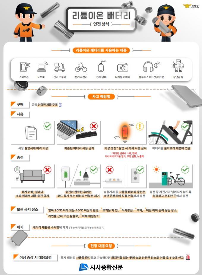 ÀÌ¿¡ ³ªÁּҹ漴 ½Ã¹Îµé¿¡°Ô ¹èÅ͸® ÈÀçÀÇ À§Ç輺À» ¾Ë¸®°í, ¾ÈÀü¼öÄ¢ Áؼö¸¦ µ¶·ÁÇϱâ À§ÇØ ÁýÁß È«º¸¸¦ Àü°³ÇÒ ¿¹Á¤ÀÌ´Ù ¡ãKC ÀÎÁõ Á¤Ç° ¹èÅ͸® ¹× ÃæÀü±â »ç¿ë ¡ã ÃæÀü Àü ¼Õ»ó¡¤½À±â¡¤°í¿Â ³ëÃâ ¿©ºÎ È®ÀÎ ¡ãÃæÀü »óÅ ¼ö½Ã Á¡°Ë ¡ã¿ÏÃæ ÈÄ Áï½Ã ºÐ¸® ¹× ÁÖº¯ °¡¿¬¹° Á¦°Å µîÀÌ ÀÖ´Ù.