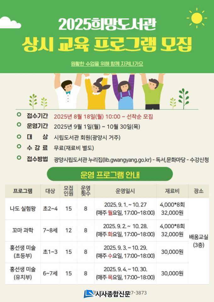 ½Ã¹Îµ¶¼Çб³´Â ±¤¾ç½Ã¸³µµ¼°ü ¼Ò¼Ó µµ¼°üÀÌ ÇÔ²² ¿î¿µÇÏ´Â »ç¾÷À¸·Î, µµ¼°üº°·Î ´ë»ó°ú ÁÖÁ¦¸¦ ´Þ¸®ÇØ ¸ÂÃãÇü µ¶¼¹®È ÇÁ·Î±×·¥À» Á¦°øÇÑ´Ù. ±¤¾çÈñ¸Áµµ¼°üÀº ¿µÀ¯¾Æ¸¦ ´ë»óÀ¸·Î ÇÑ ¡¸¾ÆÀ徯Àå Ã¥³îÀÌÅÍ¡¹¿Í ¡¸²Þ²Ù´Â Ã¥³îÀÌÅÍ¡¹¸¦ °¢°¢ 7ȸ¾¿ ¿î¿µÇÑ´Ù.
