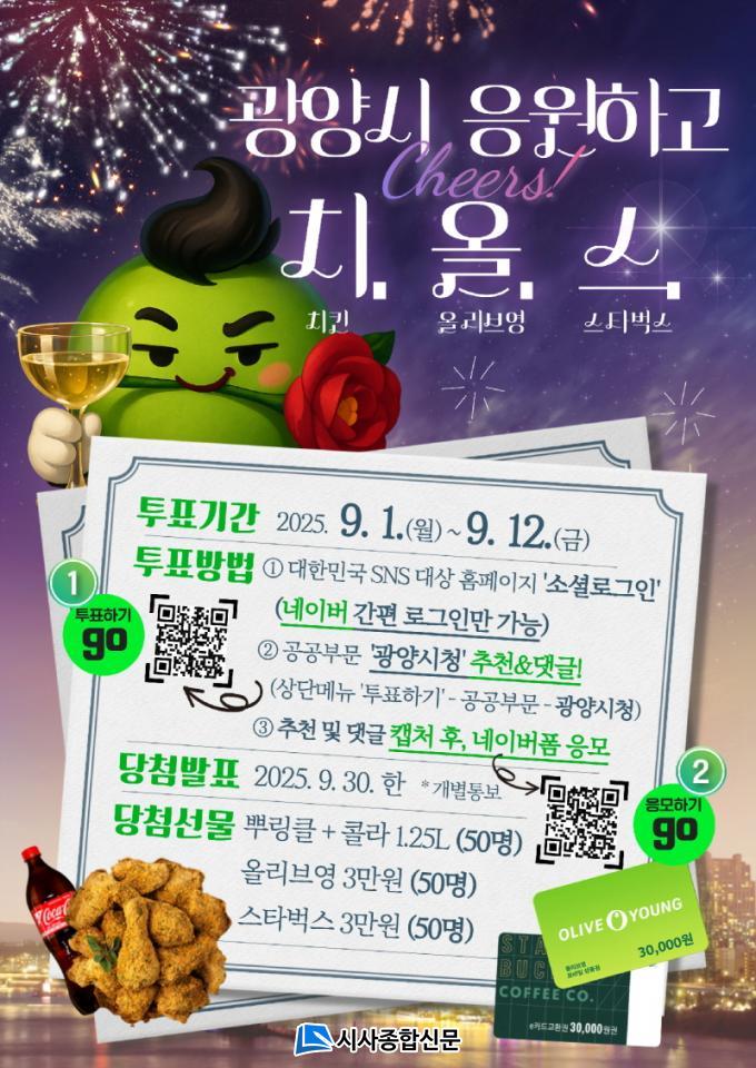 ¿Â¶óÀÎ À̺¥Æ® Âü¿© Èñ¸ÁÀڴ ȨÆäÀÌÁö(http://snsawards.com/vote2025_2/1476789)¿¡ Á¢¼ÓÇØ ³×À̹ö °£Æí ·Î±×ÀÎ ÈÄ, °ø°øºÎ¹® ¡®±¤¾ç½Ãû¡¯ ÆäÀÌÁö¿¡ µé¾î°¡ Ãßõ ¹öưÀ» ´·¯ ÅõÇ¥Çϰí ÀÀ¿ø ´ñ±ÛÀ» ³²±ä µÚ, ÇØ´ç ȸéÀ» ĸó(½ºÅ©¸°¼¦)ÇØ ³×À̹öÆû(https://naver.me/IM4yCZRR)¿¡ Á¦ÃâÇÏ¸é µÈ´Ù.