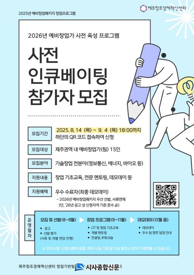 [½Ã»çÁ¾ÇսŹ® = °í¼º¹Î ±âÀÚ] Á¦ÁÖâÁ¶°æÁ¦Çõ½Å¼¾ÅÍ(´ëÇ¥ÀÌ»ç À̺´¼±, ÀÌÇÏ Á¦ÁÖ¼¾ÅÍ)´Â 2025³â ¿¹ºñâ¾÷ÆÐŰÁö â¾÷ÇÁ·Î±×·¥ ¡®»çÀü ÀÎÅ¥º£ÀÌÆÃ ÇÁ·Î±×·¥'¿¡ Âü¿©ÇÒ ¿¹ºñâ¾÷ÀÚ¸¦ ¸ðÁýÇÑ´Ù°í 26ÀÏ ¹àÇû´Ù.