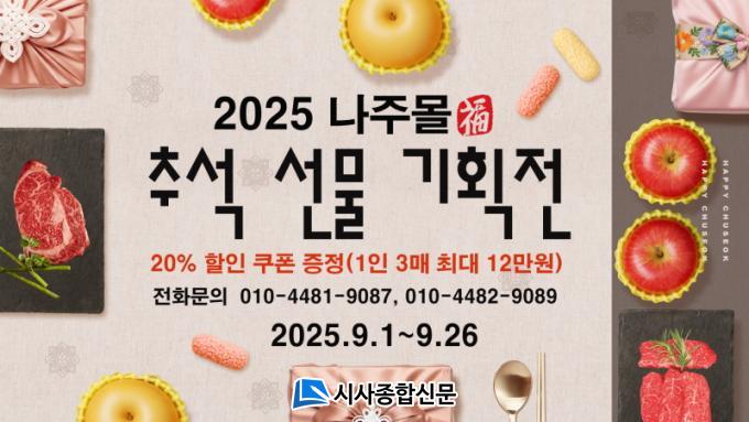 ³ªÁÖ½Ã(½ÃÀå À±º´ÅÂ)´Â ¿À´Â 9¿ù 26ÀϱîÁö ¡®2025 ³ªÁÖ¸ô Ãß¼® ¸íÀý ƯÆÇÀü¡¯À» ¿°í ³ªÁÖ¹è, ¹èÁó, ½Ò, È«¾î, ÇÑ¿ì µî ´ëÇ¥ ³óƯ»ê¹°À» Æ÷ÇÔÇÑ Àü ǰ¸ñÀ» 20% ÇÒÀÎÇÑ´Ù°í 3ÀÏ ¹àÇû´Ù.