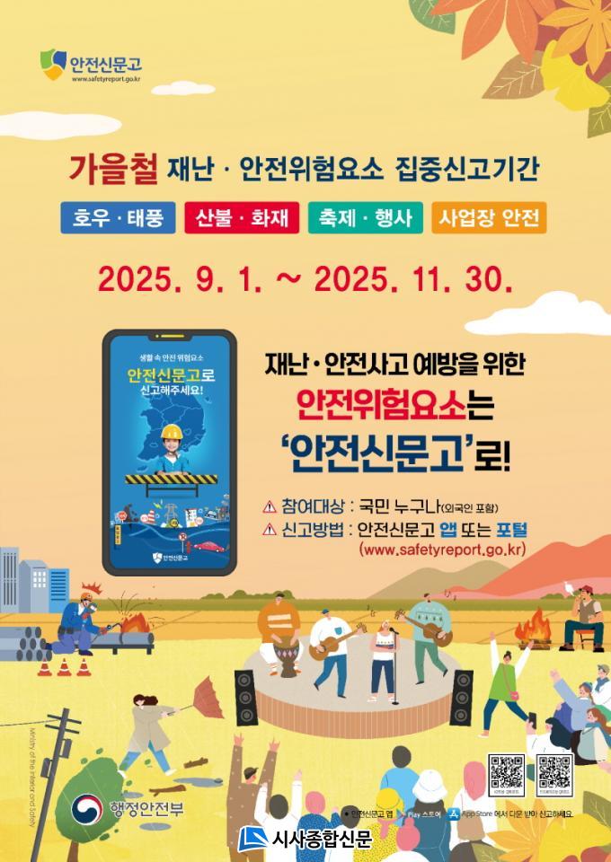 À̹ø ÁýÁß½Å°í ±â°£Àº °¡À»Ã¶¿¡ ¹ß»ý °¡´É¼ºÀÌ ³ôÀº À糡¤¾ÈÀü»ç°í¸¦ ¿¹¹æÇϱâ À§ÇÑ °ÍÀ¸·Î, ½Å°í ´ë»óÀº ÃàÁ¦¡¤Çà»ç, È£¿ì¡¤ÅÂdz, »êºÒ¡¤ÈÀç, »ç¾÷Àå ¾ÈÀü 4°³ À¯ÇüÀÌ´Ù. °¢ ½Å°í À¯ÇüÀº °¡À»Ã¶ ºó¹ßÇÏ´Â »ç°í¿Í ÃÖ±Ù À̽´¸¦ °í·ÁÇØ ¼±Á¤µÆ´Ù.