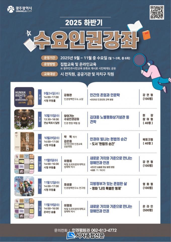 ÀÌÈÄ ±³À°ÀÏÁ¤Àº ¡ã10¿ù15ÀÏ Ã£¾Æ°¡´Â ¼ö¿äÀαǰÁÂ(°øÁ÷ÀÚ À뱂 ÇöÀå ¹æ¹®) ¡ã10¿ù29ÀÏ ºÏÅäÅ© ¡®Çå¹ýÀÇ ¼ø°£¡¯(¹ÚÇõ ÀÛ°¡) ¡ã11¿ù5ÀÏ »õ·Î¿î °¡Ä¡¿Í ±âÁØÀ¸·Î ¸¸³ª´Â Àå¾ÖÀΰú ÀαÇ(À̸íÈñ µ¶ÀÏ µµ¸£Æ®¹®Æ®´ë Àå¾ÖÇÐ ¹Ú»ç) ¡ã11¿ù12ÀÏ ¿µÈ ¡®³ªÀÇ Æ¯º°ÇÑ ÇüÁ¦¡¯·Î Ç®¾îº¸´Â Áö¹æÁ¤ºÎ°¡ ÀÖ´Â Á¸¾öÇÑ »î(ÃÖ¼ºÀ± ÀαÇÁ¤Ã¥¿¬±¸¼Ò ¿¬±¸¿ø) µîÀÌ´Ù. ƯÈ÷ 11¿ù19ÀÏ¿¡´Â ¾Õ¼ 11¿ù5ÀÏ ÃÊûÇÑ À̸íÈñ ¹Ú»çÀÇ °¿¬ ³»¿ëÀ» ¿Â¶óÀÎ À¯Æ©ºê(±¤ÁÖ±¤¿ª½Ã ¹ÎÁֽùα³À°)·Î ¼ÛÃâ, °ü½É ÀÖ´Â ½Ã¹Î ´©±¸³ª ½ÃûÇÒ ¼ö ÀÖµµ·Ï ÇÒ °èȹÀÌ´Ù.