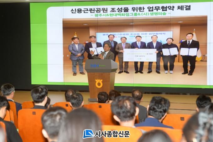 ±¤Áֽô ¾Õ¼ Áö³ 7¿ù22ÀÏ Çö´ë¹éÈÁ¡±×·ì, (»ç)»ý¸íÀǽ£°ú ÇÔ²² ¡®¹Î°ü Çù·ÂÇü µµ½Ã°ø¿ø Á¶¼º»ç¾÷¡¯ ÃßÁøÀ» À§ÇÑ ±âºÎ ¾÷¹«Çù¾àÀ» ü°áÇß´Ù. À̹ø Áֹμ³¸íȸ´Â ±×¿¡ µû¸¥ ÈÄ¼Ó ÀýÂ÷·Î, ½Å¿ë±Ù¸°°ø¿ø Á¶¼º»ç¾÷ÀÇ ±âº»±¸»óÀ» °øÀ¯Çϰí ÁֹΠÀǰßÀ» ¹Ý¿µÇϱâ À§ÇØ ¸¶·ÃµÆ´Ù.