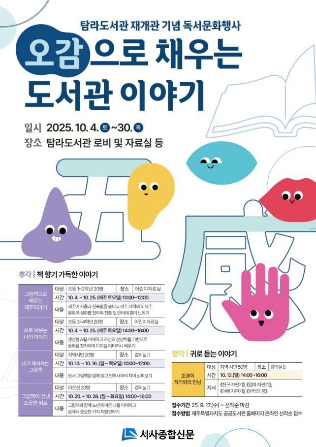 ÇÁ·Î±×·¥ Âü¿©¸¦ ¿øÇÏ´Â ½Ã¹ÎÀº 9¿ù 17ÀϺÎÅÍ Á¦ÁÖÆ¯º°ÀÚÄ¡µµ °ø°øµµ¼°ü ´©¸®Áý(https://www.jeju.go.kr/lib) ¡æ Çà»ç/ÇÁ·Î±×·¥ ¡æ µµ¼°üÇÁ·Î±×·¥½Åû ¸Þ´º¸¦ ÅëÇØ Á¢¼öÇÒ ¼ö ÀÖ´Ù. ÀÚ¼¼ÇÑ ³»¿ëÀº ޶󵵼°ü(¢Ï064-728-8373)À¸·Î ¹®ÀÇÇÏ¸é µÈ´Ù.