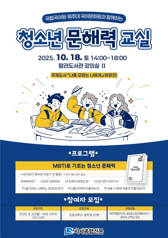 À̹ø ÇÁ·Î±×·¥Àº ¡®MBTI·Î ±â¸£´Â û¼Ò³â ¹®Çط¡¯À» ÁÖÁ¦·Î ¿À´Â 10¿ù 18ÀÏ ¿ÀÈÄ 2½ÃºÎÅÍ 6½Ã±îÁö ÃʵîÇб³ 6Çг⿡¼ ÁßÇб³ 3Çгâ ÇлýÀ» ´ë»óÀ¸·Î ÁøÇàµÈ´Ù.
