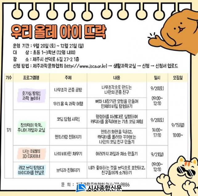 [½Ã»çÁ¾ÇսŹ® = °í¼º¹Î ±âÀÚ] Á¦ÁÖ°úÇй®ÈÇùȸ(ÀÌ»çÀå °í¿ëö)´Â Á¦ÁÖÆ¯º°ÀÚÄ¡µµ°³¹ß°ø»çÀÇ Áö¿øÀ» ¹Þ¾Æ µµ³» ÃʵîÇб³ 1~3Çгâ ÇлýµéÀ» ´ë»óÀ¸·Î »ýȰ°úÇб³½Ç°ú ÇÔ²² ÇÏ´Â ÁÖ¸» µ¹º½ ¡®¿ì¸® ¿Ã·¹ ¾ÆÀ̶߶ô¡¯À» À̹ø ÁÖ¸» 9¿ù20ÀÏ(Åä) ºÎÅÍ ½ÃÀÛÇÏ¿© 12¿ù±îÁö ÃÑ 13±â¿¡ °ÉÃÄ ¿î¿µÇÑ´Ù.