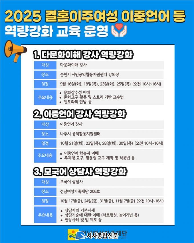 | Àü³²¿©¼º°¡Á·Àç´Ü, 2025 °áÈ¥ÀÌÁÖ¿©¼º ´Ù¹®ÈÀÌÇØ°»ç µî ¿ª·®°È ±³À° °³° °áÈ¥ÀÌÁÖ¿©¼º ºÐ¾ßº° ¿ª·®°È ±³À°À¸·Î Àü¹® ÃUµ¿ ¿µ¿ª È®Àå Áö¿ø