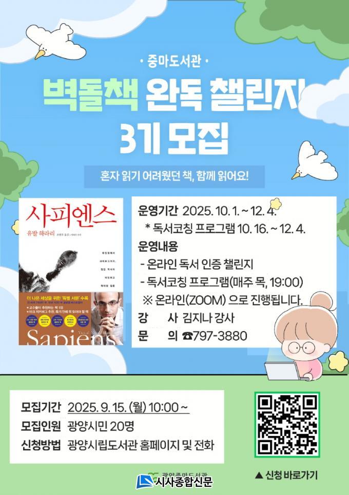 ¸ðÁýÀοøÀº 20¸í, Á¢¼ö ±â°£Àº 9¿ù 28ÀϱîÁö´Ù. Âü¿© ½ÅûÀº ±¤¾ç½Ã¸³µµ¼°ü ´©¸®Áý(lib.gwangyang.go.kr)ÀÇ ¡®µ¶¼¡¤¹®È¸¶´ç¡¯, ¡®¼ö° ½Åû¡¯ ¸Þ´º¸¦ ÅëÇØ °¡´ÉÇϸç, ÀÚ¼¼ÇÑ »çÇ×Àº Á߸¶µµ¼°üÆÀ(¢Ï061-797-3880)À¸·Î ¹®ÀÇÇÏ¸é µÈ´Ù.