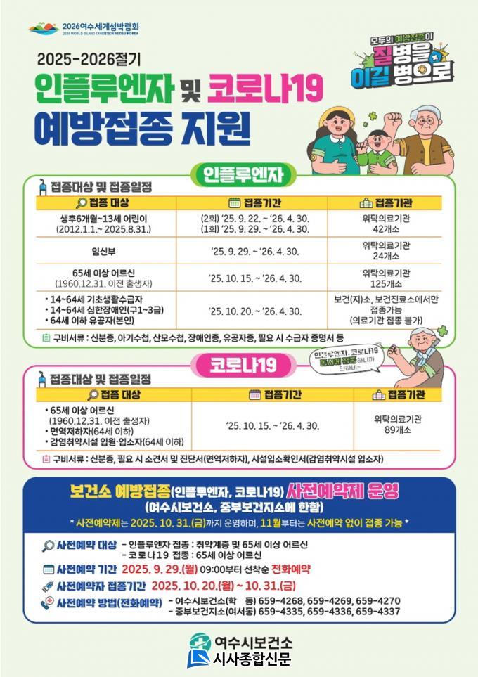 ¿©¼ö½Ãº¸°Ç¼Ò¿Í Áߺκ¸°ÇÁö¼Ò´Â 10¿ù ÇÑ ´Þ°£ 65¼¼ ÀÌ»ó ¾î¸£½Å°ú Ãë¾à°èÃþÀ» ´ë»óÀ¸·Î »çÀü¿¹¾àÁ¦¸¦ ¿î¿µÇÑ´Ù. ¿¹¾àÀº 9¿ù 29ÀÏ ¿ÀÀü 9½ÃºÎÅÍ ¼±Âø¼ø ÀüÈ·Î °¡´ÉÇÏ¸ç ¿¹¾àÀÚ Á¢Á¾ ±â°£Àº 10¿ù 20ÀϺÎÅÍ 31ÀϱîÁö´Ù.