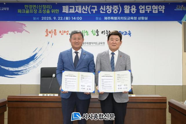 [½Ã»çÁ¾ÇսŹ® = °í¼º¹Î ±âÀÚ] Á¦ÁÖÆ¯º°ÀÚÄ¡µµ±³À°Ã»(±³À°°¨ ±è±¤¼ö)°ú Á¦ÁÖ½Ã(½ÃÀå ±è¿Ï±Ù)´Â 22ÀÏ ¿ÀÈÄ 2½Ã µµ±³À°Ã»¿¡¼ ÇѰæ¸é ½Å⸮ ¿¾ ½ÅâÁßÇб³ ºÎÁö¸¦ Ȱ¿ëÇÑ ÆÄÅ©°ñÇÁÀå Á¶¼º»ç¾÷ ÃßÁøÀ» À§ÇÑ ¾÷¹«Çù¾àÀ» ü°áÇß´Ù.