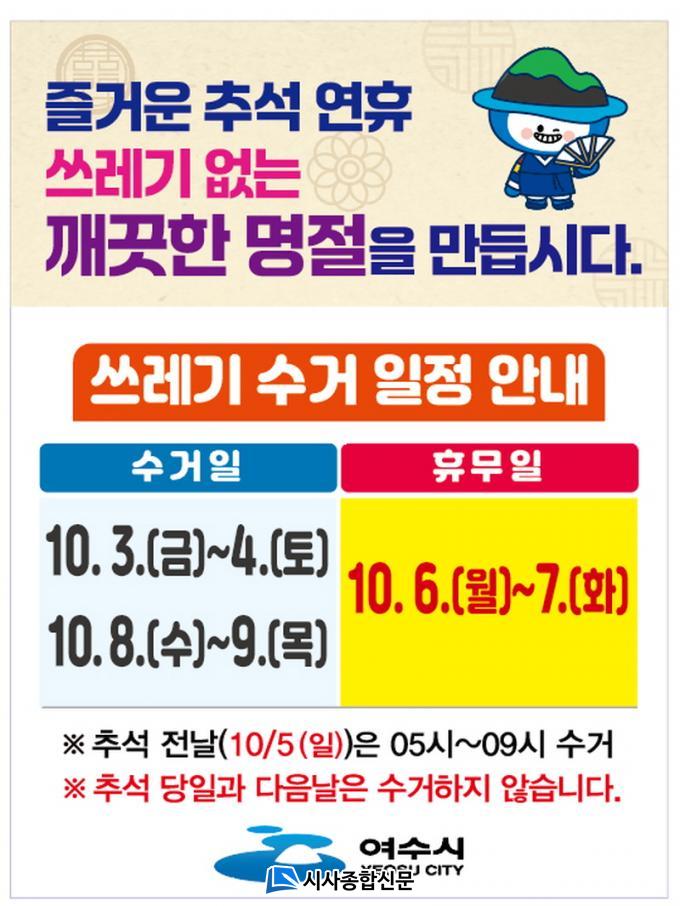 ¿¬ÈÞ Áß »ýȰÆó±â¹° ¼ö°Å´Â ¡ã10¿ù 5ÀÏ(ÀÏ) ¿ÀÀü 5½ÃºÎÅÍ 9½Ã±îÁö ´ÜÃà ¼ö°Å¸¦ ½Ç½ÃÇÏ¸ç ¡ãÃß¼® ´çÀÏ 6ÀÏ(¿ù)°ú ´ÙÀ½ ³¯ 7ÀÏ(È)¿¡´Â ¼ö°Å¸¦ ÇÏÁö ¾Ê´Â´Ù. ÀÌ¿Ü ¡ã10¿ù 3ÀÏ(±Ý), 4ÀÏ(Åä), 8ÀÏ(¼ö), 9ÀÏ(¸ñ)Àº Æò»ó½Ã¿Í °°ÀÌ Á¤»ó ¼ö°ÅÇÑ´Ù.