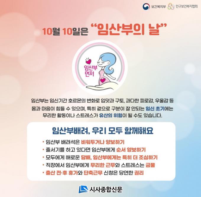 ¿ÃÇØ·Î Á¦20ȸ¸¦ ¸Â´Â ÀÓ»êºÎÀÇ ³¯Àº ¡®¸ðÀÚº¸°Ç¹ý¡¯¿¡ µû¶ó Á¦Á¤µÈ ¹ýÁ¤ ±â³äÀϷΠdz¿ä¿Í ¼öÈ®À» »ó¡ÇÏ´Â 10¿ù°ú ÀӽűⰣ 10°³¿ùÀ» ÀǹÌÇÏ´Â 10¿ù 10ÀÏÀÌ´Ù. ÀÓ»êºÎÀÇ ³¯Àº ÀӽŰú Ãâ»êÀÌ »çȸÀûÀ¸·Î Á¸Áß¹Þ°í ¾çÀ°ÀÇ ¾î·Á¿òÀ» ÇÔ²² ÇØ°áÇØ¾ß ÇÑ´Ù´Â »çȸÀû ¸Þ½ÃÁö¸¦ ´ã°í ÀÖ´Ù.