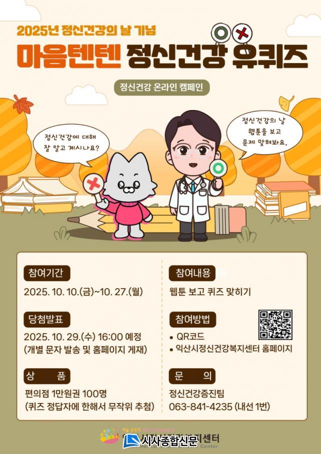 Ä·ÆäÀο¡ Âü¿©ÇÏ·Á¸é ÀÍ»ê½ÃÁ¤½Å°Ç°º¹Áö¼¾ÅÍ ´©¸®Áý(www.iksanmh.or.kr)¿¡¼ Á¤½Å°Ç° °ü·Ã À¥Å÷À» º¸°í ¹®Á¦¸¦ Ç®¸é µÈ´Ù. Á¤´äÀÚ Áß 100¸íÀ» ÃßÃ·ÇØ ¼ÒÁ¤ÀÇ »óǰÀ» Á¦°øÇϸç, ´ç÷ÀÚ´Â ¿À´Â 29ÀÏ °³º° ¾È³»µÈ´Ù.