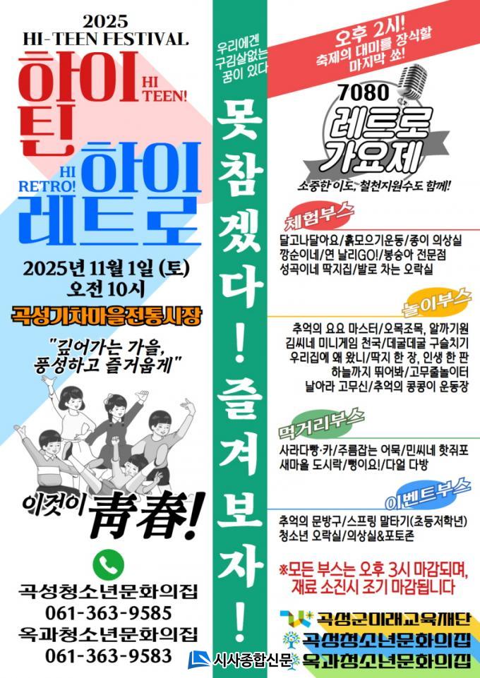 ÇÑÆí, 2025 °î¼ºÃ»¼Ò³â ÇÏÀÌÆ¾ Æä½ºÆ¼¹ú ¡®HI-TEEN, HI-RETRO¡¯´Â û¼Ò³âµéÀÇ ¹®ÈÀû °¨¼º°ú âÀǼºÀ» Ç¥ÇöÇÒ ¼ö ÀÖ´Â ÀåÀ¸·Î, RETRO °¡¿äÁ¦, üÇ衤³îÀÌ¡¤¸Ô°Å¸®¡¤À̺¥Æ® ºÎ½º µî ÃÑ 28°³ÀÇ ºÎ½º°¡ ¿î¿µµÉ ¿¹Á¤ÀÌ´Ù. Çà»ç´Â ¿À´Â 11¿ù 1ÀÏ °î¼º±âÂ÷¸¶À»ÀüÅë½ÃÀå ÀÏ¿ø¿¡¼ °³ÃÖµÉ ¿¹Á¤ÀÌ´Ù.