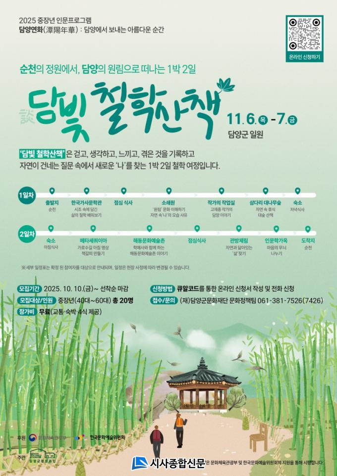 ¸ðÁý ´ë»óÀº Àü³² ¼øÃµ½Ã ÀÏ¿ø¿¡ °ÅÁÖÇϰí ÀÖ´Â 40~60´ë ÁßÀå³â ÃÑ 20¸íÀ̸ç, Âü°¡ºñ´Â ¹«·á(±³Å롤¼÷¹Ú¡¤1¹Ú 2ÀÏ 4½Ä Á¦°ø)´Ù. ¸ðÁý ±â°£Àº 10¿ù 31ÀϱîÁöÀ̸ç QRÄڵ带 ÅëÇØ ¿Â¶óÀÎÀ¸·Î ½Åû¼¸¦ ÀÛ¼ºÇϰųª ÀüÈ(061-381-7426)·Î Á¢¼öÇÒ ¼ö ÀÖ´Ù.
