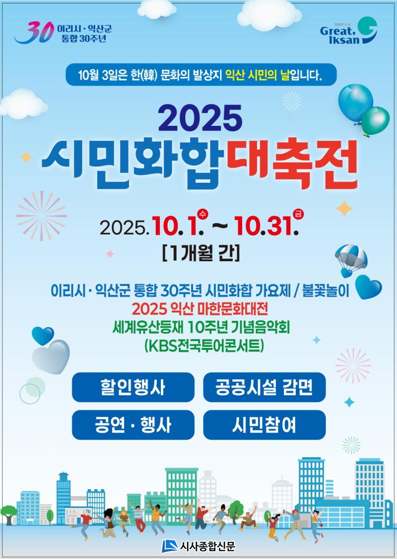 ÀÍ»ê½Ã´Â À̸®½Ã¡¤Àͻ걺 ÅëÇÕ 30ÁÖ³âÀ» ±â³äÇØ 10¿ù ÇÑ ´Þ°£ ½Ã¹ÎµéÀÌ Àϻ󿡼 ¹®È¿Í ¿©°¡¸¦ Áñ±æ ¼ö ÀÖ´Â '½Ã¹ÎÈÇÕ´ëÃàÀü'À» À̾°í ÀÖ´Ù.