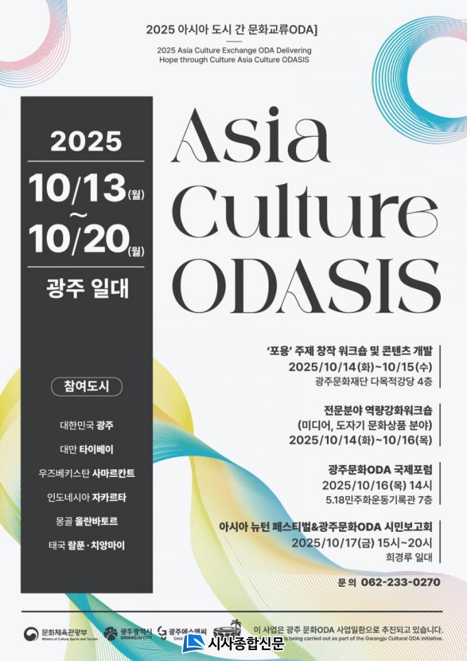 ¡®±¤ÁÖÇü ¹®È °øÀû°³¹ß¿øÁ¶(ODA)-¾Æ½Ã¾Æ ÄÃÃÄ ¿À´Ù½Ã½º(Asia Culture ODASIS)¡¯´Â ±¤ÁÖ¸¦ Áß½ÉÀ¸·Î ¡ã¸ù°ñ ¿ï¶õ¹ÙÅ丣 ¡ãÀεµ³×½Ã¾Æ ÀÚÄ«¸£Å¸ ¡ãű¹ ¶÷Ǭ¡¤Ä¡¾Ó¸¶ÀÌ ¡ã¿ìÁŰ½ºÅº »ç¸¶¸£ÄÆ® ¡ã´ë¸¸ Ã¢È µî ¾Æ½Ã¾Æ 6°³±¹ 7°³ µµ½ÃÀÇ Ã»³â¿¹¼ú°¡ 70¿© ¸íÀÌ Âü¿©ÇÏ´Â ±¹Á¦ ¹®È¿¹¼ú Çù·Â»ç¾÷ÀÌ´Ù. À̵éÀº µµ½ÃÀç»ý, Áö¿ª Æ¯È ¹®È»óǰ °³¹ß, ¹Ìµð¾î¾ÆÆ® µî ´Ù¾çÇÑ Çù¾÷ÇÁ·ÎÁ§Æ®¸¦ ÃßÁøÇß´Ù.