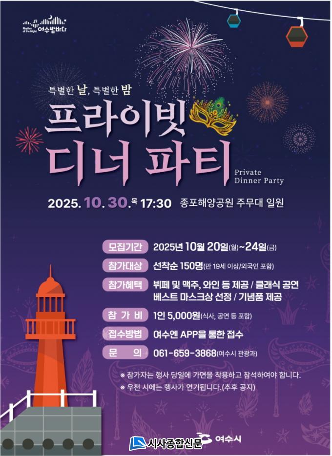 [½Ã»çÁ¾ÇսŹ® = ¿À½ÂÅà ±âÀÚ] ¿©¼ö½Ã(½ÃÀå Á¤±â¸í)´Â ¿À´Â 10¿ù 30ÀÏ Á¾Æ÷ÇØ¾ç°ø¿ø ÁÖ¹«´ë ÀÏ¿ø¿¡¼ ¡®Æ¯º°ÇÑ ³¯, Ưº°ÇÑ ¹ã ÇÁ¶óÀ̺ø µð³Ê ÆÄƼ¡¯¸¦ °³ÃÖÇÑ´Ù. ÀÌ¿¡ ¾Õ¼ ½Ã´Â 20ÀϺÎÅÍ 24ÀϱîÁö 5Àϰ£ Âü°¡ÀÚ 150¸íÀ» ¼±Âø¼øÀ¸·Î ¸ðÁýÇÑ´Ù.