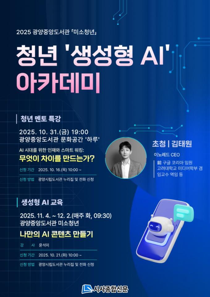 ¡®Ã»³â ¸àÅä Æ¯°¡¯Àº 10¿ù 16ÀÏ(¸ñ) ¿ÀÀü 10½ÃºÎÅÍ, ¡®»ý¼ºÇü AI ±³À°¡¯Àº 10¿ù 21ÀÏ(È) ¿ÀÀü 10½ÃºÎÅÍ °¢°¢ ¼±Âø¼øÀ¸·Î Á¢¼öÇϸç, ±¤¾ç½Ã¸³µµ¼°ü ´©¸®Áý°ú ÀüÈ(¢Ï061-797-3864)·Î ½ÅûÇÒ ¼ö ÀÖ´Ù. ÀÚ¼¼ÇÑ »çÇ×Àº ±¤¾çÁß¾Óµµ¼°üÀ¸·Î ¹®ÀÇÇÏ¸é µÈ´Ù