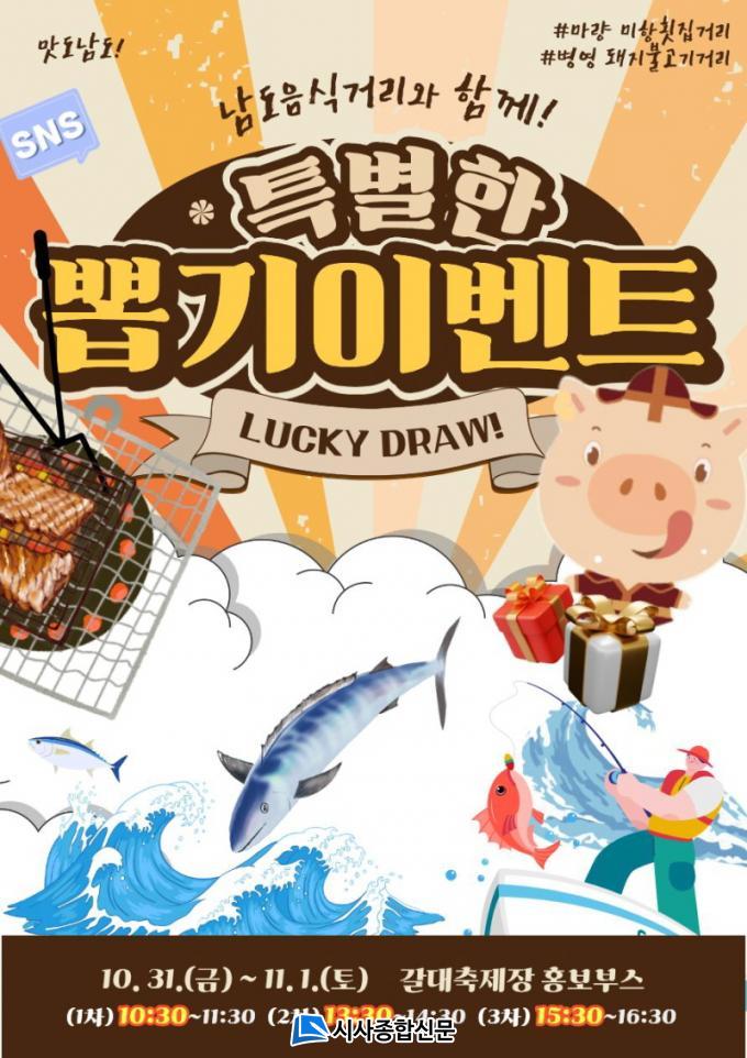 À̺¥Æ® ¿î¿µ½Ã°£Àº 1Â÷ ¿ÀÀü 10½Ã30~11½Ã30ºÐ 2Â÷ ¿ÀÈÄ 1½Ã30~2½Ã30ºÐ 3Â÷ ¿ÀÈÄ 3½Ã30~4½Ã30ºÐÀ̸ç, ȸÂ÷´ç Âü¿© ÀοøÀº 120¸íÀ¸·Î Á¦ÇѵȴÙ. »óǰÀ¸·Î´Â ³²µµÀ½½Ä°Å¸® À̹ÌÁö°¡ µé¾î°£ ´Ù¾çÇÑ ±â³äǰÀÌ¸ç ²Î¾ø´Â À̺¥Æ®·Î ´©±¸³ª ¼Ò¼ÒÇÑ Çà¿îÀ» ´©¸± ¼ö ÀÖ´Ù.
