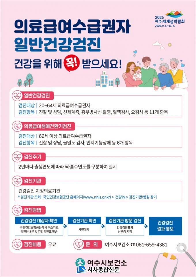 ÀÇ·á±Þ¿©¼ö±Þ±ÇÀÚ Áß 20¼¼ ÀÌ»ó 64¼¼ ÀÌÇÏ´Â ÀϹݰǰ°ËÁø ´ë»óÀÚ·Î 2³â¸¶´Ù Ãâ»ý ¿¬µµ¿¡ µû¶ó ¦¡¤È¦¼ö ¿¬µµ·Î ±¸ºÐÇØ ½Ç½ÃÇÑ´Ù. ¿ÃÇØ´Â Ȧ¼ö³âµµ Ãâ»ýÀÚ°¡ ´ë»óÀÌ¸ç ½Åü°èÃø¡¤Ç÷¾×°Ë»ç¡¤±¸°°ËÁø µî Ç׸ñÀ» Àü¾× ¹«·á·Î ¹ÞÀ» ¼ö ÀÖ´Ù.