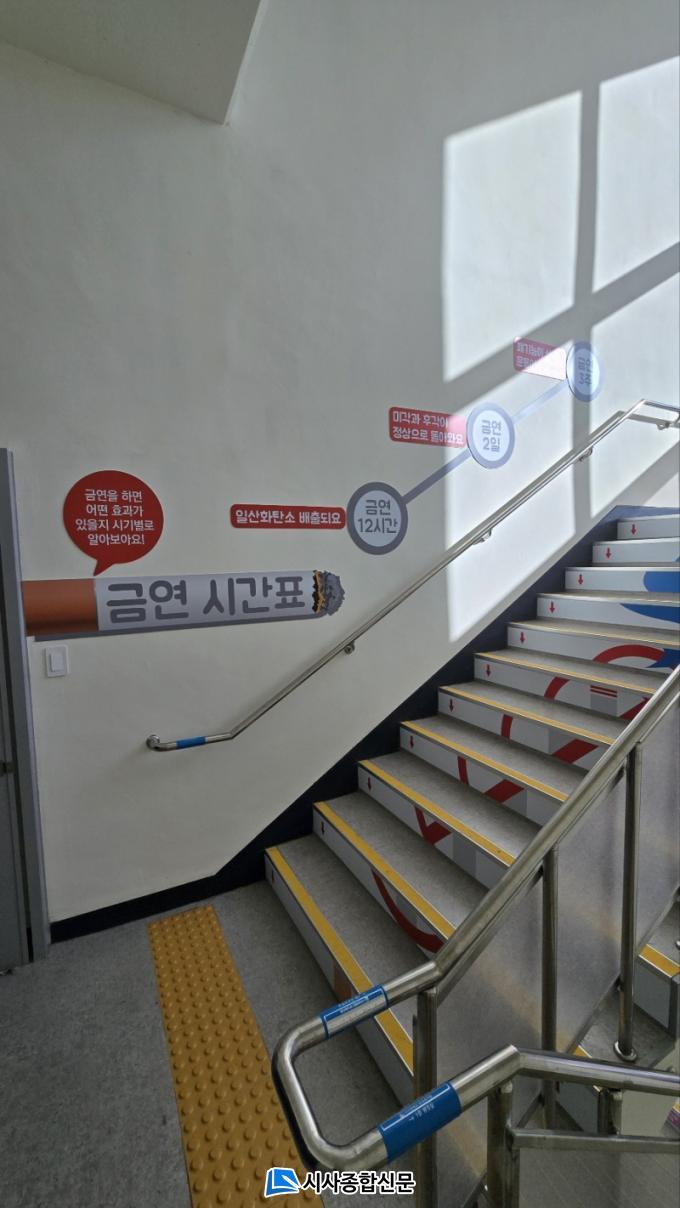 Çб³ ÁÖ¿ä °Ç¹° ³»ºÎ °è´Ü¿¡ ¼³Ä¡µÈ °Ç°°è´ÜÀº ±Ý¿¬¡¤±ÝÁÖ¸¦ ÁÖÁ¦·Î ÇÑ ¹®±¸¿Í À̹ÌÁö°¡ ºÎÂøµÇ¾î ÇлýµéÀÌ ÀÚ¿¬½º·´°Ô °Ç° ¸Þ½ÃÁö¸¦ Á¢ÇÒ ¼ö ÀÖµµ·Ï ¸¸µé¾ú´Ù.