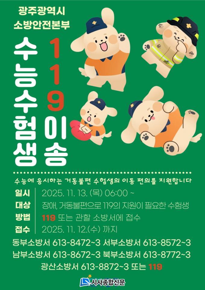 [½Ã»çÁ¾ÇսŹ® = ¿À½ÂÅà ±âÀÚ] ±¤ÁÖ±¤¿ª½Ã ¼Ò¹æ¾ÈÀüº»ºÎ´Â ´ëÇмöÇдɷ½ÃÇèÀÏÀÎ 11¿ù13ÀÏ °Åµ¿ÀÌ ºÒÆíÇÑ ¼öÇè»ýµéÀÇ À̵¿ ÆíÀǸ¦ À§ÇØ ¡®119 À̼ÛÁö¿ø ¼ºñ½º¡¯¸¦ Á¦°øÇÑ´Ù.
